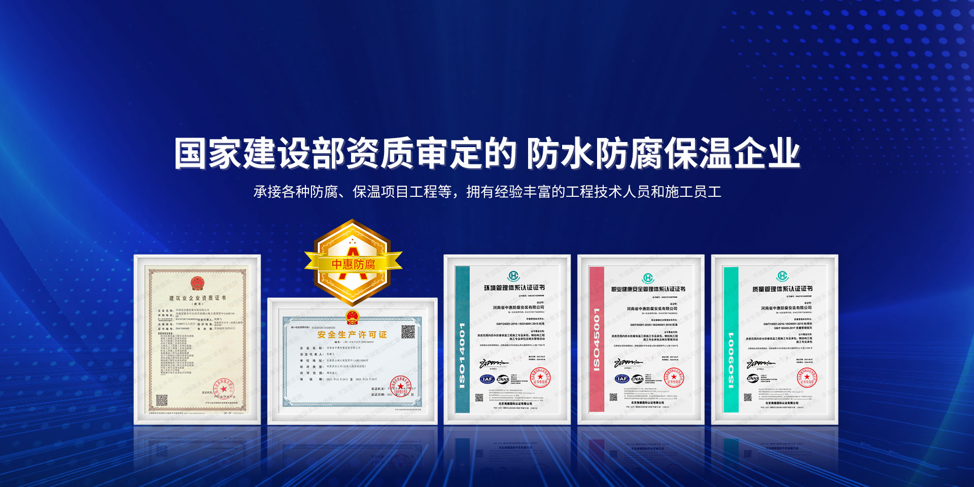 公司經營范圍:防水防腐保溫工程;消防設施工程;建筑裝修裝飾工程;建筑機電安裝工程;電力工程;建筑工程;石油化工工程;工業(yè)清洗工程;油罐清洗工程;鋼結構工程;環(huán)保工程;模板腳手架工程;電纜防火封堵、防污閃噴涂、外墻外保溫工程;各類施工勞務作業(yè);設備維修、船舶鉚焊、涂裝;電力工程材料、建材、防水材料、防火材料、防腐保溫材料銷售,并相繼通過了GB/T19001-2008idtISO9001:2008GB/T50430-2007質量管理體系認證證書。GB/T24001-2004idtISO14001:2004環(huán)境管理體系認證證書。GB/T28001-2011idtOHSAS18001:2007職業(yè)健康安全管理體系認證證書。公司是中國防腐蝕于防護協(xié)會、中國施工企業(yè)管理協(xié)會、電力協(xié)會和中國鋼結構防水協(xié)會會員單位。 公司的經營業(yè)務涵蓋了石油、化工、電力、冶金、煤炭、船舶、國防、燃氣、水利、環(huán)保、交通運輸、航空及國防軍工和輕紡市政等行業(yè)的防腐保溫絕熱設備。鋼結構安裝、防火、防水、金屬噴鍍、聚脲噴繪、陰極保護、防滲透堵漏、玻璃鋼及各種磚版材料襯里、橡膠襯里、煙氣硫和耐酸溶劑腐蝕等工程施工。公司連續(xù)十年榮獲“省市先進施工企業(yè)”“安全生產先進單位”“重合同,守信用企業(yè)”和“AA***資質企業(yè)”的稱號。2000年被命名為市級文明單位,2002年被國家工商行政管理局命名為“重合同,守信用的企業(yè)”、被中國工業(yè)防腐蝕技術協(xié)會命名為“防腐蝕企業(yè),能源節(jié)約及環(huán)境保護領域有豐富的經驗和***的業(yè)績。工程一次交驗合格率100%。其中攀枝花鋼鐵公司煉鐵廠四號高爐及熱風爐防腐工程、上海寶鋼公司煤氣柜防腐工程、撫順石油一廠裝置防腐項目、齊魯石化公司稀烴廠高塔防腐工程、吉林化學工業(yè)公司煉油廠油罐防腐工程、天津石化熱電廠六號爐頂棚聯(lián)絡管保溫工程、大慶油田(太倉)力神泵業(yè)工程、中國化學工程第十一建設工程、中原油田勘探局工程、中國石化銷售有限公司華北分部、魯皖輸油管道工程、貴州開磷息烽合成氨工程、陜西黃陵煤化工程、中國石油天然氣西部管道塔里木輸油工程、邯鋼集團邯寶鋼鐵公司煉鐵工程、德州供電工程、吉寶(南通)船廠工程,偃師華潤熱力工程、鄭州熱力總公司。 河南省中惠防腐安裝有限公司愿以豐富的施工經驗,***的技術,***的設備,***的管理,***的服務,竭誠為國內外廣大的用戶提供***滿意、******的工程作品。 我公司愿與國內外同仁一道,團結協(xié)作,共同推進防腐蝕行業(yè)發(fā)展! 公司地址:河南省長垣縣建設路北段360號 固定電話:0373-8866488 郵編:453400 網址:http://www_zhff_com_cn.zhongxiaojp.com